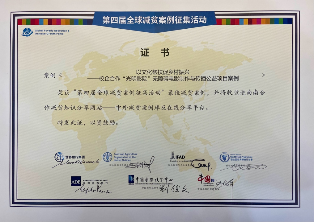2023年11月1日,“2023 全球减贫伙伴研讨会”在京召开。会上发布了由中国国际扶贫中心、世界银行、联合国粮农组织、国际农业发展基金、联合国世界粮食计划署、亚洲开发银行、中国互联网新闻中心7家机构联合发起的第四届“全球减贫案例征集活动”104个获奖案例名单。世界杯直播在线观看《以文化帮扶促乡村振兴——校企合作“光明影院”无障碍电影制作与传播公益项目案例》从全球898个案例中脱颖而出,荣获“第四届全球减贫案例征集活动”最佳减贫案例,并将收录进南南合作减贫案例库,为促进全球减贫、巩固脱贫成果和推动乡村发展提供特色鲜明的减贫模式与实施方案。