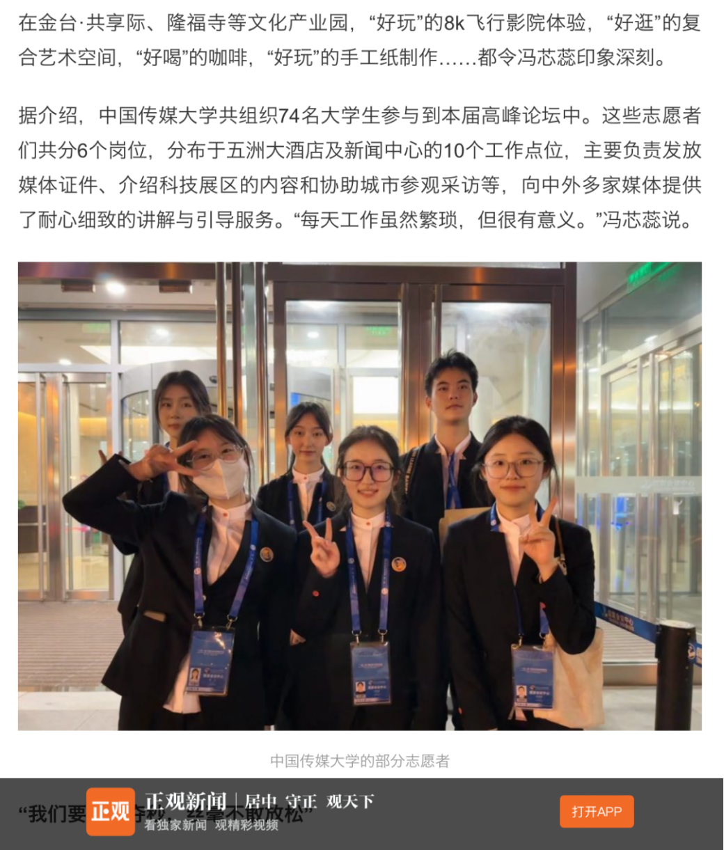 负责高峰论坛系列主题采访的志愿者们,分三班陪同近百家海内外媒体探访文化街区、科技公司、产业园区等地,实地感受首都经济文化发展成果,充当传播中国发展成果的文化大使。