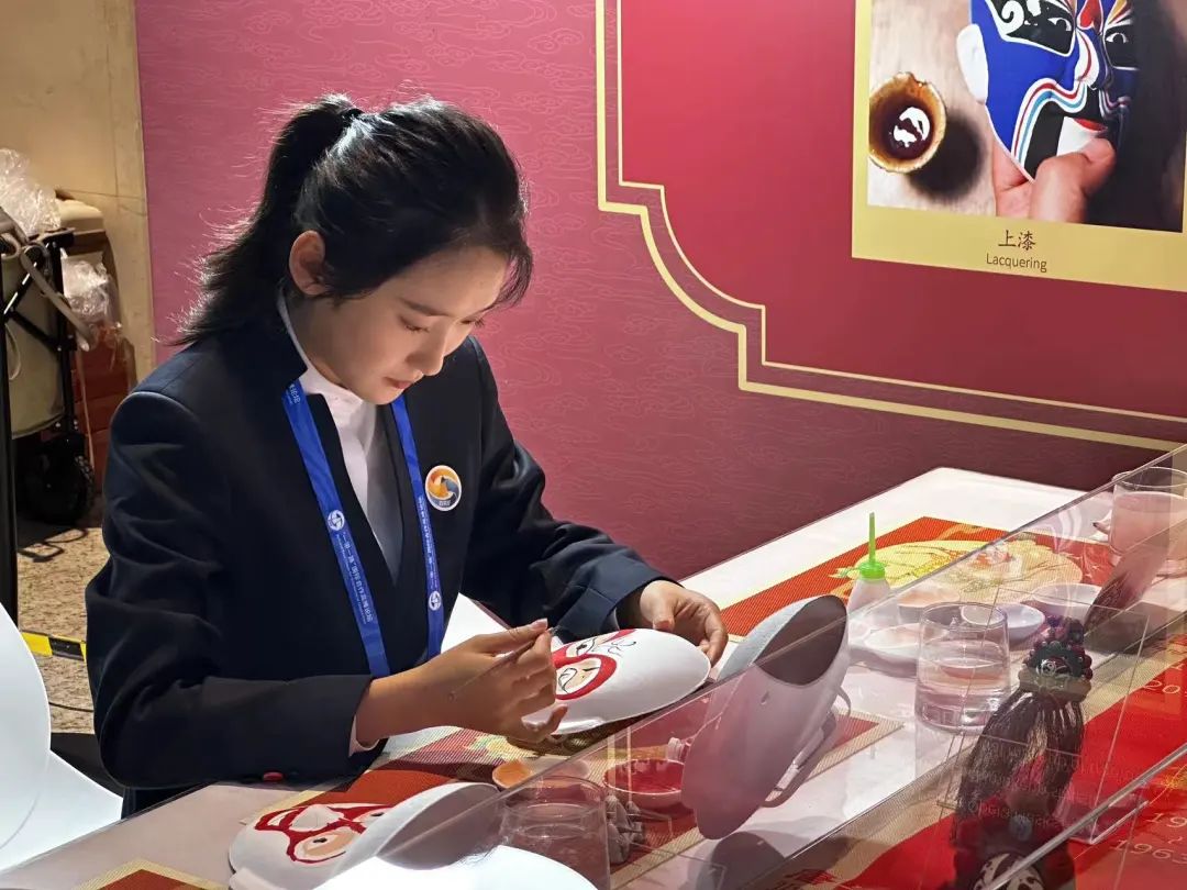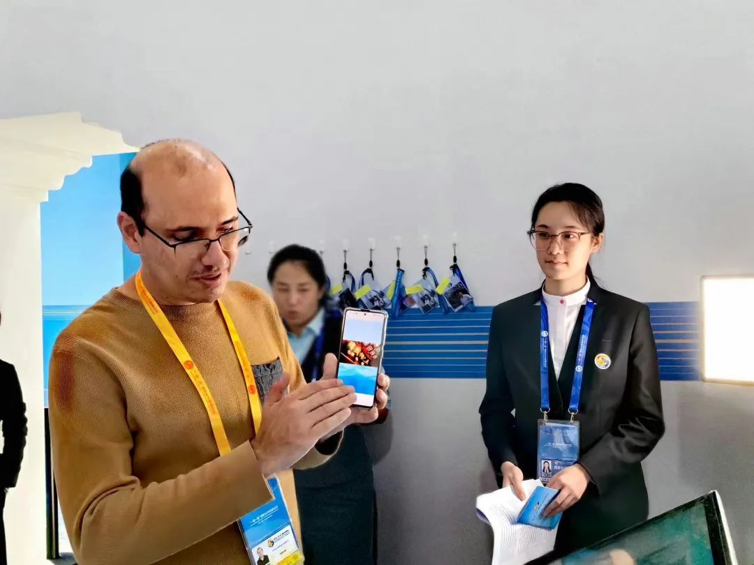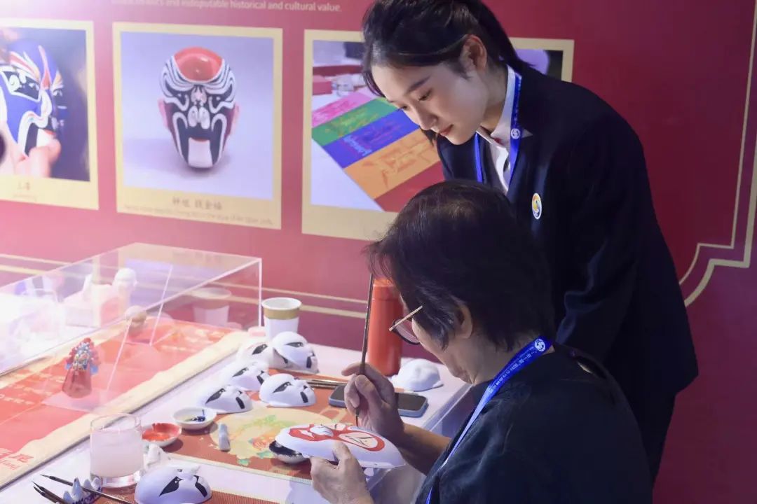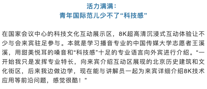 在国家会议中心的科技文化互动展示区,AI绘画、360度虚拟拍摄、8K超高清沉浸式互动体验等科技成果吸引众多来宾驻足体验,中传志愿者热情接待,认真讲解,为3300余人次提供了讲解服务。