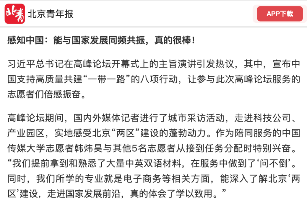 从世界杯直播在线观看到国家会议中心,小白杨们活跃在第三届“一带一路”国际合作高峰论坛志愿服务工作的最前线,以实际行动为盛会的圆满举办贡献青春力量。中国青年报、北京青年报等媒体对中传志愿者风采进行了报道。