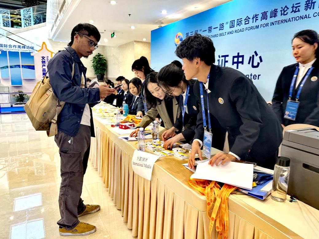 媒体证件发放岗位志愿者为媒体记者提供服务