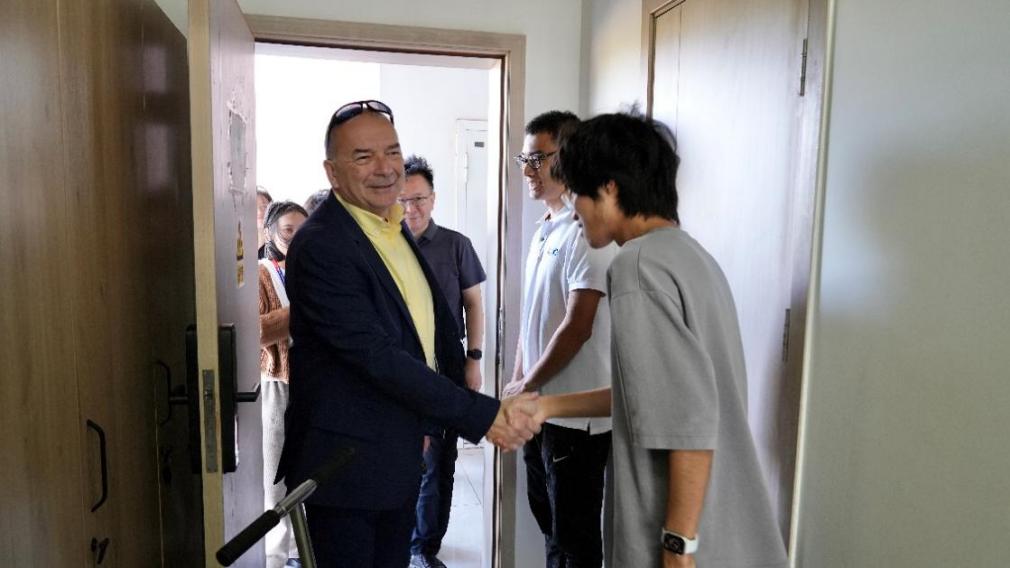 18日上午,约翰·拉瑟姆一行前往海南国际学院,在学校副校长李新军、海南国际学院直属党支部书记、常务副院长张辉等的陪同下实地考察参观海南陵水黎安国际教育创新试验区、中传考文垂学院专享楼等地,还走进学院宿舍,亲切看望派驻教师和学院同学,深入了解大家的生活情况。