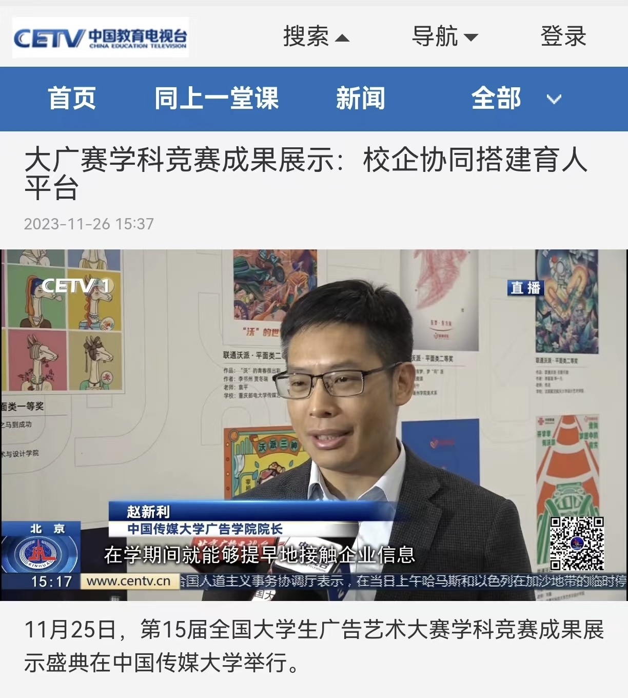 在颁奖典礼上,世界杯直播在线观看广告学院院长赵新利接受了中国教育电视台的采访。他提到“大广赛让学生在学期间就能够提早地接触企业信息,了解企业的需求,能够真题真做,进入到企业各种传播活动当中去,为他们未来的就业,未来进入这个社会打下更好的基础。”