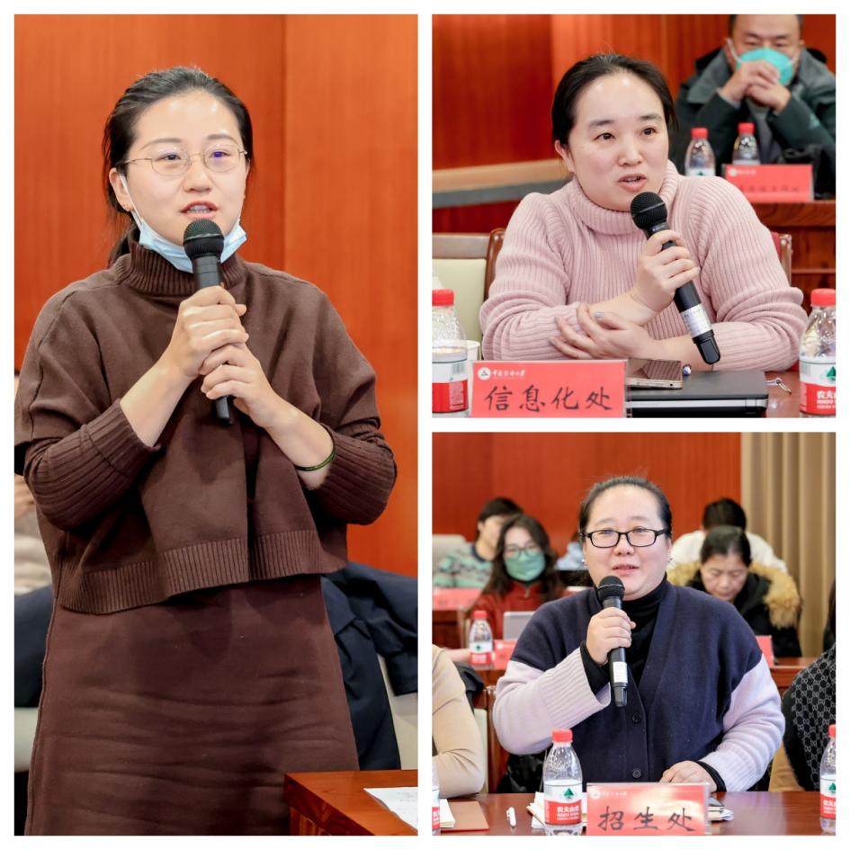 招生处办公室主任孟婕、信息化处办公室主任刘燕玲、新闻学院办公室主任南秀渊结合自己实际工作进行交流发言,对未来的工作提出建议。