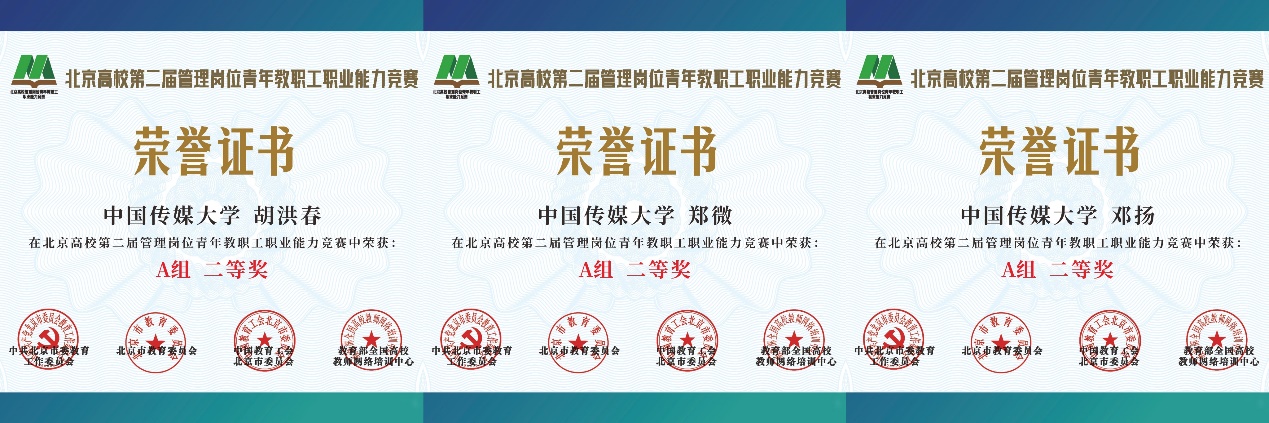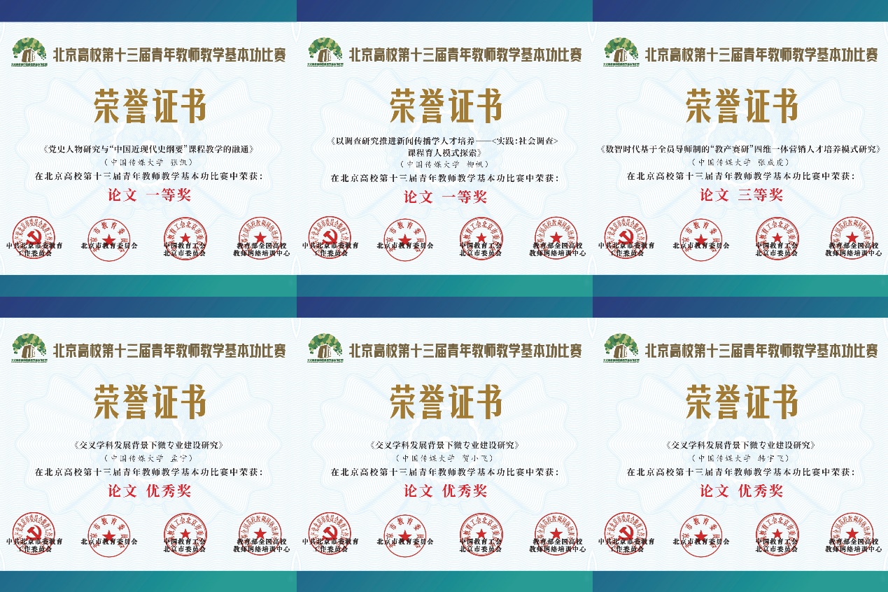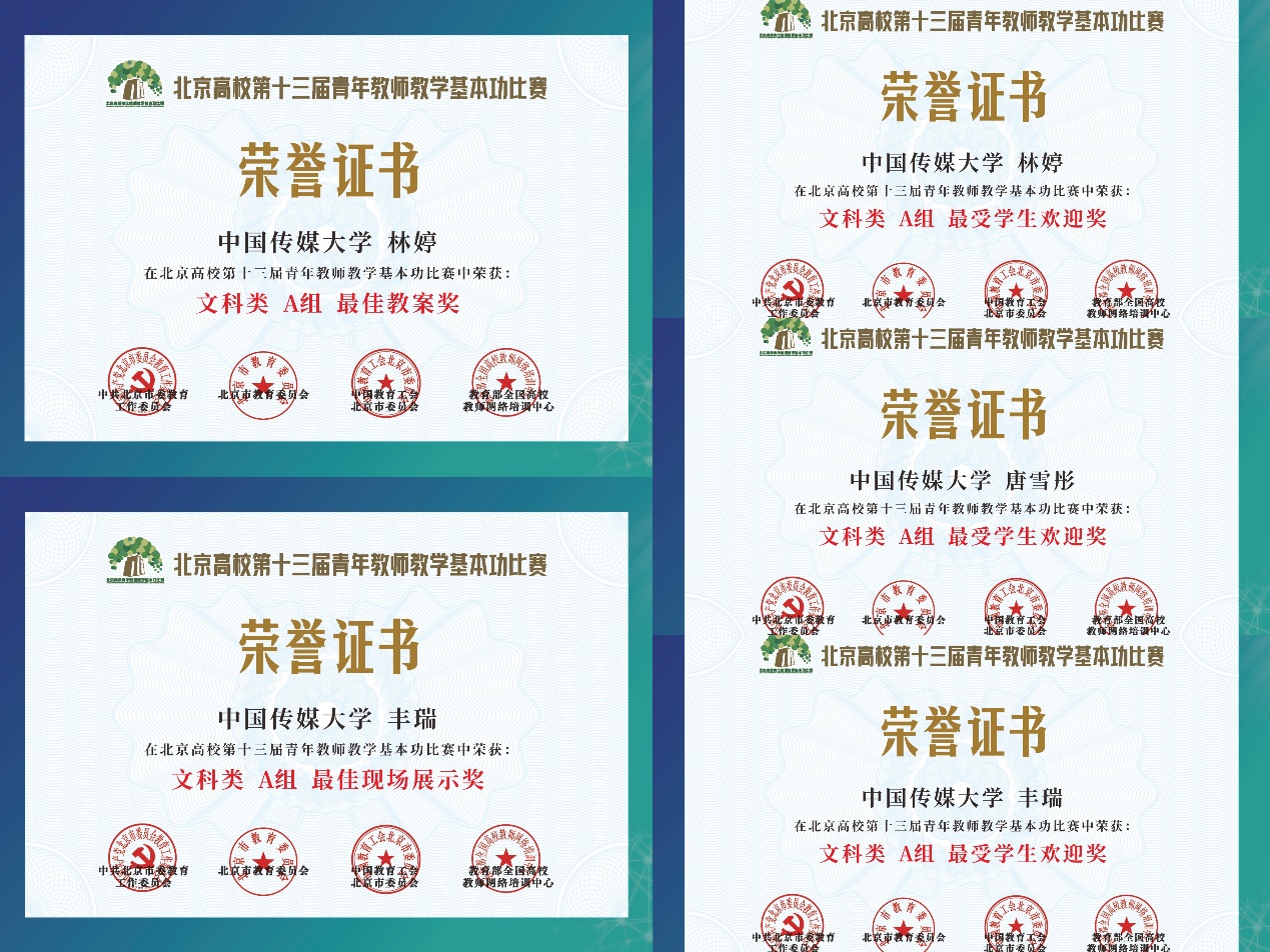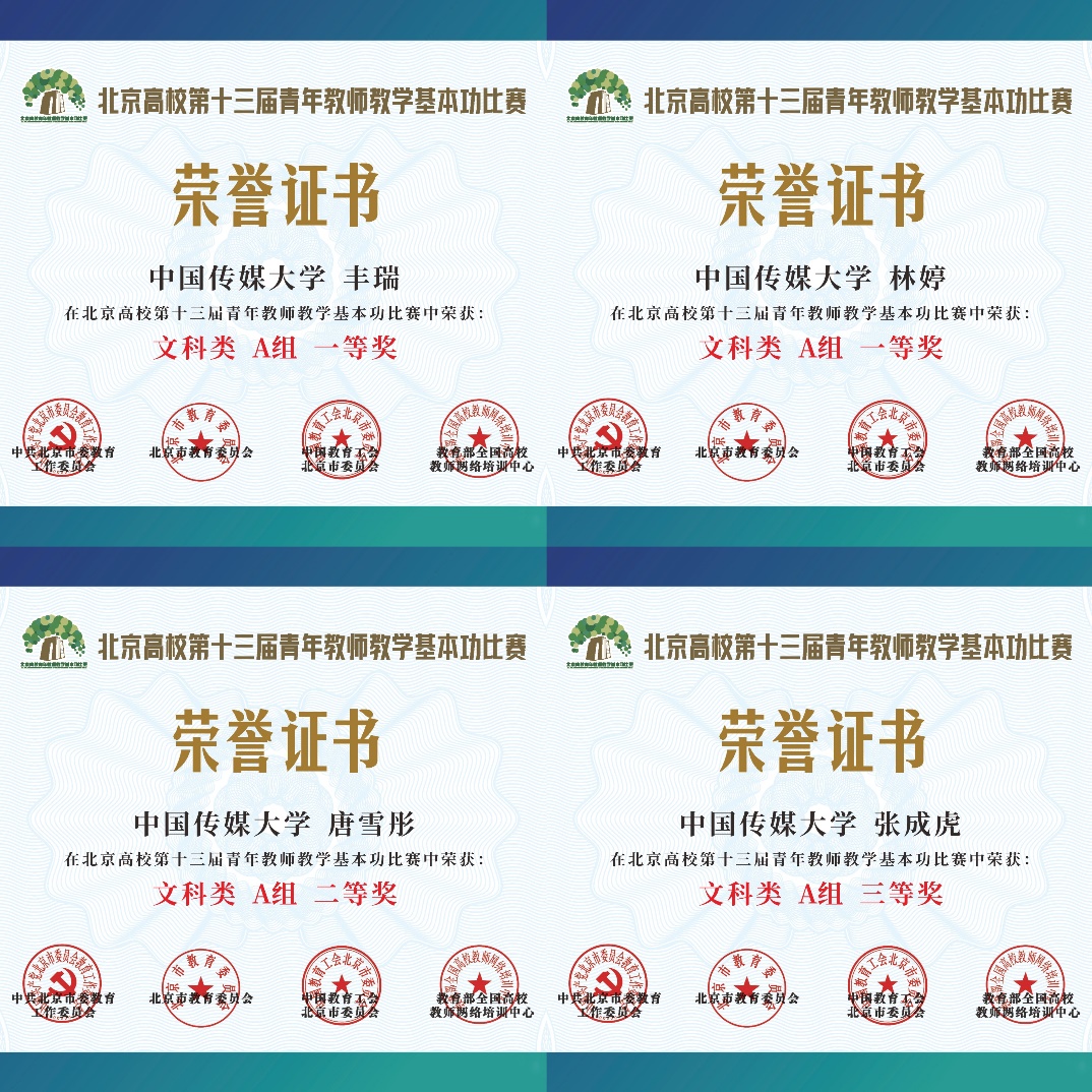 柳长安宣读表彰决定。大会向北京高校第十三届青年教师教学基本功比赛及第二届管理岗位青年教职工职业能力竞赛获奖选手代表及获奖单位代表颁发了证书和奖杯。我校电视学院丰瑞老师作为青教赛一等奖获奖代表上台领奖。同时,我校还获得最佳组织奖和突出贡献奖,本科生院副院长贺小飞、工会常务副主席李宸屹分别作为获奖单位代表上台领奖。在北京高校第十三届青年教师教学基本功比赛及第二届管理岗位青年教职工职业能力竞赛系列活动中,我校共计获得19项荣誉。