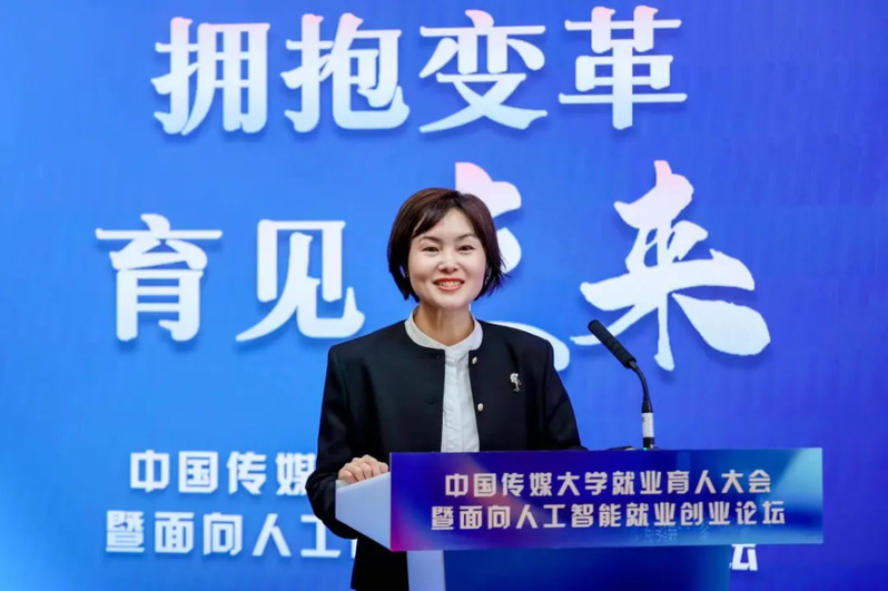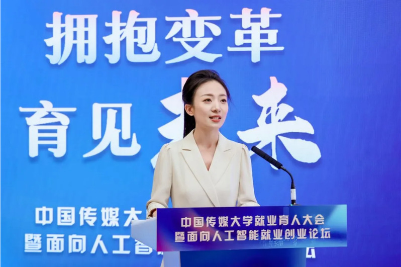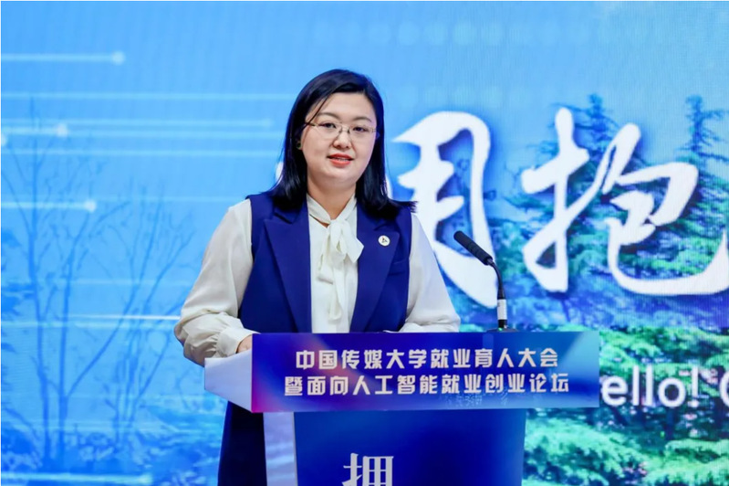 动画与数字艺术学院数字媒体艺术专业硕士研究生王琳作为学生代表,就时代浪潮中学业与就业的关联思考和探索实践进行发言。她表示,人工智能正为青年学子提供前所未有的机遇和可能性。只有把人工智能从工具变为伙伴,更多参与到产教研合作的实习实训中,才能不断提升自身的综合素质和就业竞争力。
