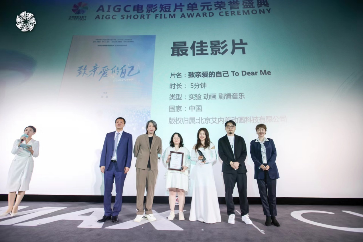 嘉宾们共同揭晓AIGC电影短片单元的荣誉影片,分别是最佳影片:《致亲爱的自己 To Dear Me》、最佳创意:《明日说法:大圣落网记》、最佳美术设计:《达芬奇计划:新文艺复兴Neo-Renaissance》、最佳视效:《颅内花园》、最佳人气:《冰火之春》;及十部优秀作品:《虫洞坍缩》《永不失联(Love,Lost& Plane)》《AI升职记》《地球,家,火鸡农场》《如此生活三十年》《流浪月球:最后的种子》《蜕化》《光影无界——电影艺术的演变与未来》《宇宙回音》《赞比亚奥德赛 ZAMBIA Space Odyssey》。 获得荣誉的创作者依次发表感言,共同分享他们的喜悦和激情,分享了他们精彩的AI共创之旅。