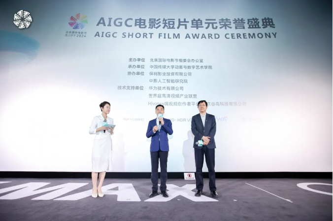 北京国际电影节组委会办公室执⾏副主任崔岩介绍了设立AIGC单元的愿景和使命,以“共享资源,共赢未来”为主旨的北京国际电影节已经成功举办了14届。今年新增的“AIGC电影短片”单元,标志着北京国际电影节正与各界影人共同探索电影的新形态,开创性地成为全球首个与AI共创的电影节。