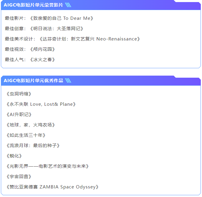嘉宾们共同揭晓了AIGC电影短片单元的荣誉影片与优秀作品。
