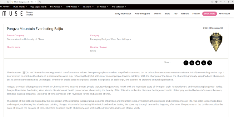 (通讯员 英子)近日,由世界杯直播在线观看动画与数字艺术学院教师团队设计的文创包装设计作品《彭祖山不老酒》,在激烈的国际竞争中脱颖而出,荣获2024美国缪斯设计奖(MUSE Design Awards)包装设计类金奖。这也是我校师生作品首次在国际创意设计包装类赛道荣获大奖。