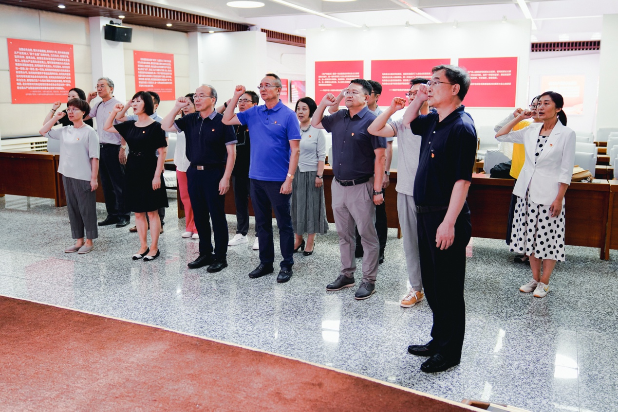 学校党委副书记、纪委书记蔺海波带领党员干部重温了入党誓词,全体党员面向党旗庄严宣誓。