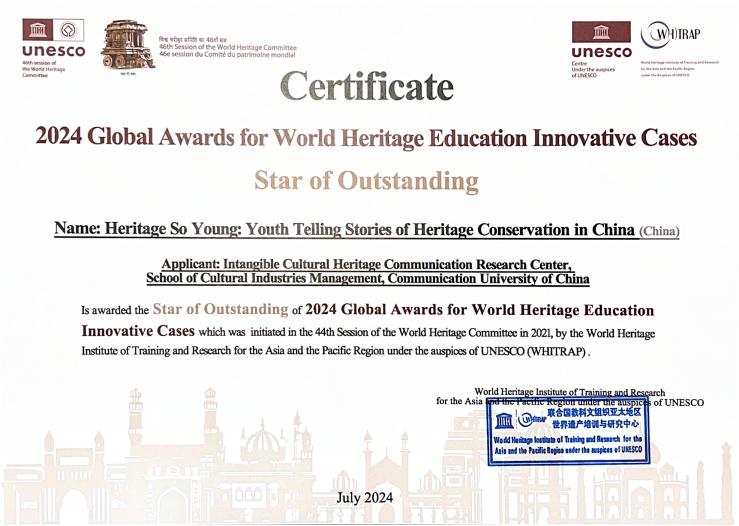 (通讯员 魏思亚)近日,第46届世界遗产大会在印度新德里举行,在“科技、创意与赋能——面向未来的世界遗产教育”主题边会上,联合国教科文组织亚太地区世界遗产培训与研究中心(WHITRAP)现场揭晓了2024“全球世界遗产教育创新案例奖”(AWHEIC)获奖名单。世界杯直播在线观看文化产业管理学院非遗传播研究中心组织申报的“遗产青年说:青年讲述遗产保护的中国经验”案例在全球一百余个参赛案例中脱颖而出,荣获2024年度“全球世界遗产教育创新案例——卓越之星奖”。
