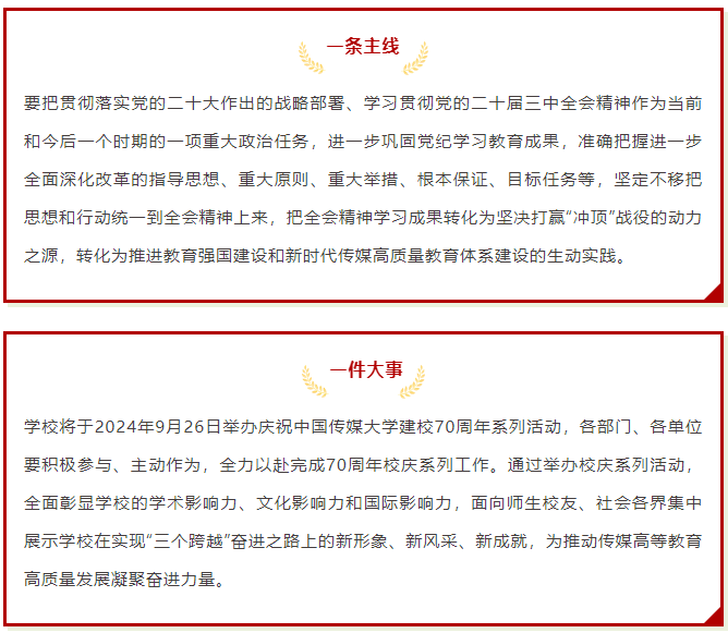 围绕秋季学期的主要目标任务,廖祥忠对重点工作提出了期望和要求,并进行了详细的部署。他指出,下半年,全校上下要将深入学习贯彻党的二十届三中全会精神切实落实在行动上,坚持以进一步全面深化改革为动力,系统谋划、推深做实,在全面深化改革中展现中传担当作为。面对人工智能等新技术变革带来的风险挑战,要以抓改革为核心,提前布局“十五五”规划工作,系统梳理学校各项改革任务,加快探索人工智能环境下的传媒高等教育变革,优化布局学校发展,围绕育人方式、办学模式、管理体制、保障机制等方面,进一步全面深化改革再出发。