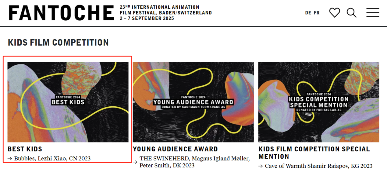 (通讯员 张若琦)瑞士巴登当地时间9月8日晚,2024 Fantoche 国际动画节(Fantoche International Animation Film)颁奖典礼隆重举行,我校动画与数字艺术学院2019级动画专业学生肖乐知、林千裕、郭欣雨的作品《泡泡抱抱》(Bubbles)从入围决赛的21部佳作中脱颖而出,荣获儿童动画竞赛单元(Kids Film Competition)最高奖——最佳儿童动画奖(Best Kids),这也是本届动画节上唯一获奖的中国作品。