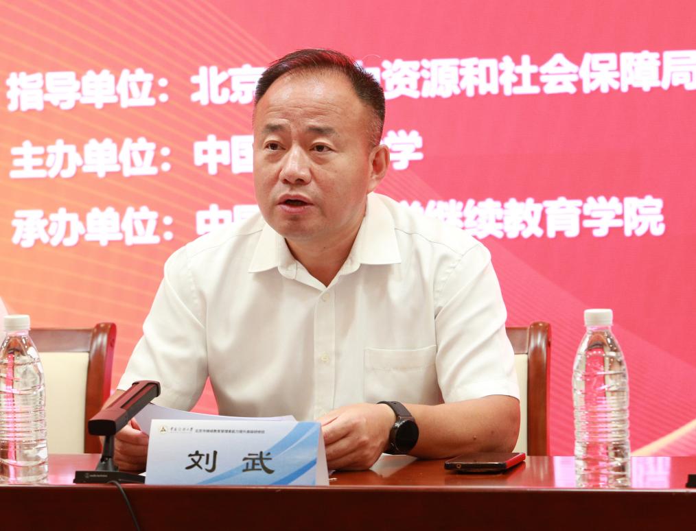 刘武在动员讲话中代表北京市人力资源和社会保障局,向研修班的顺利开班表示热烈祝贺,对我校提供的优质学习资源和服务保障表示感谢。他重点强调了继续教育工作的重要意义,并对北京市高级研修班的相关情况进行了详细介绍。刘武表示,本次研修班聚焦人才强国战略、继续教育高质量发展,旨在提高继续教育工作能力,助力首都人才培养,希望各位学员珍惜学习机会、遵守各项纪律、注重培训实效。