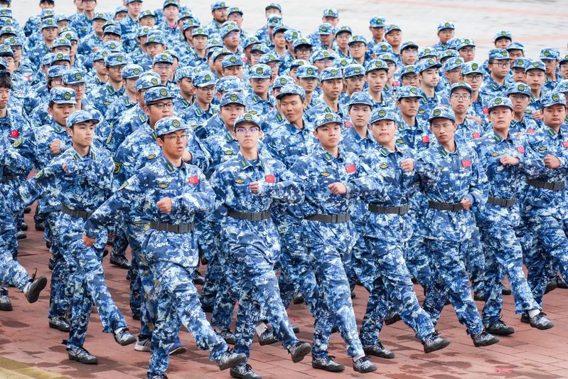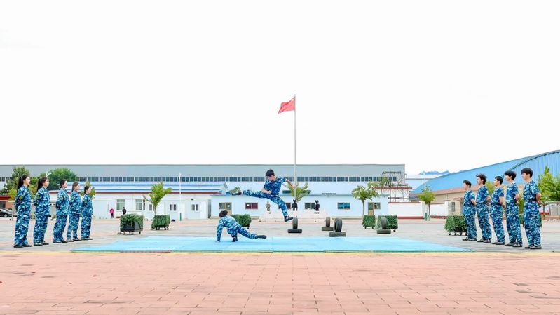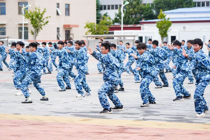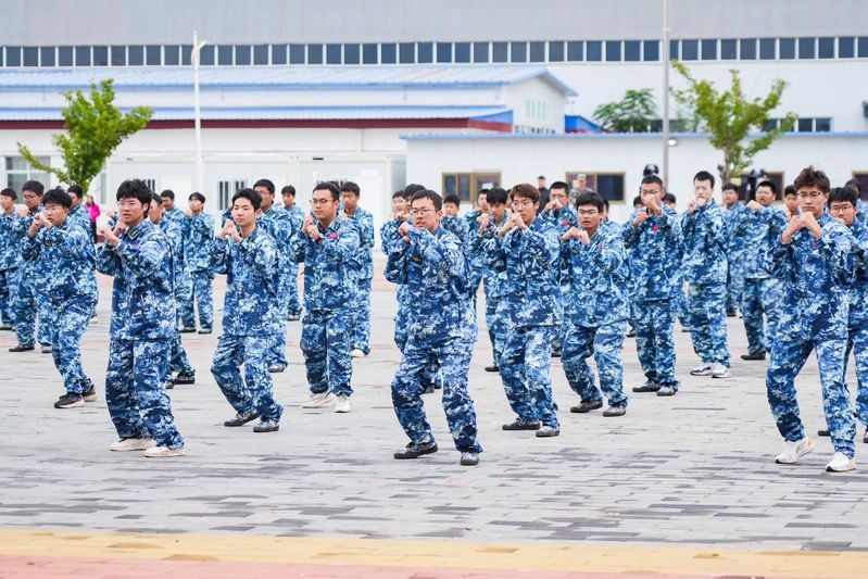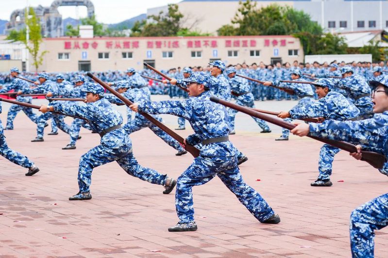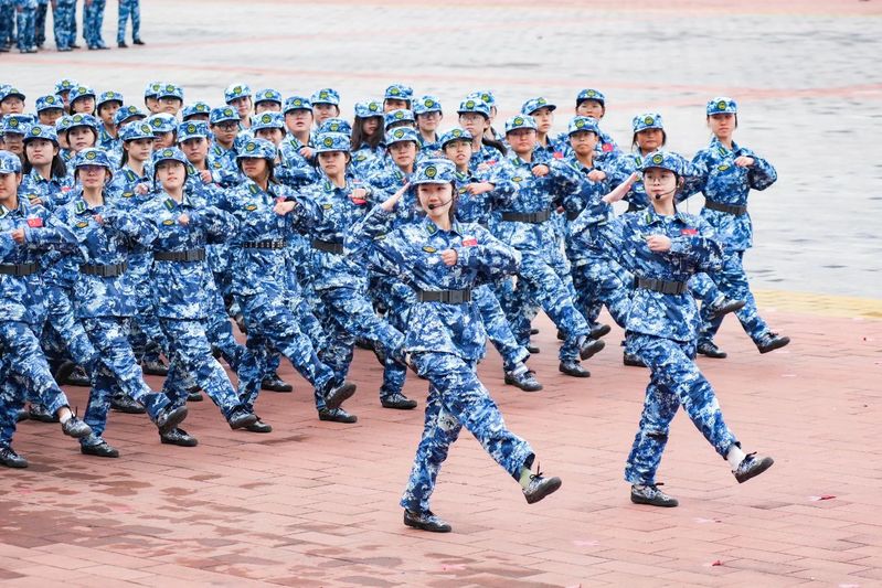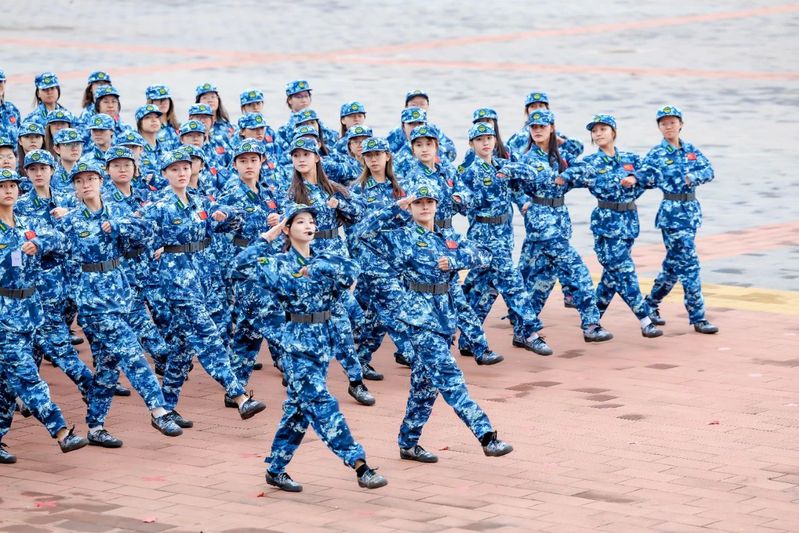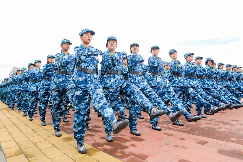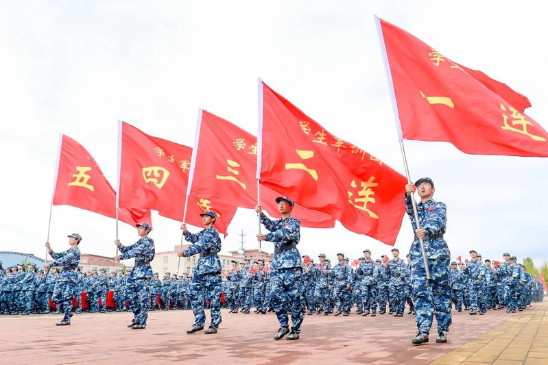 标兵就位后,参训学生组成的各连队方阵以分列式依次走过观礼台前。