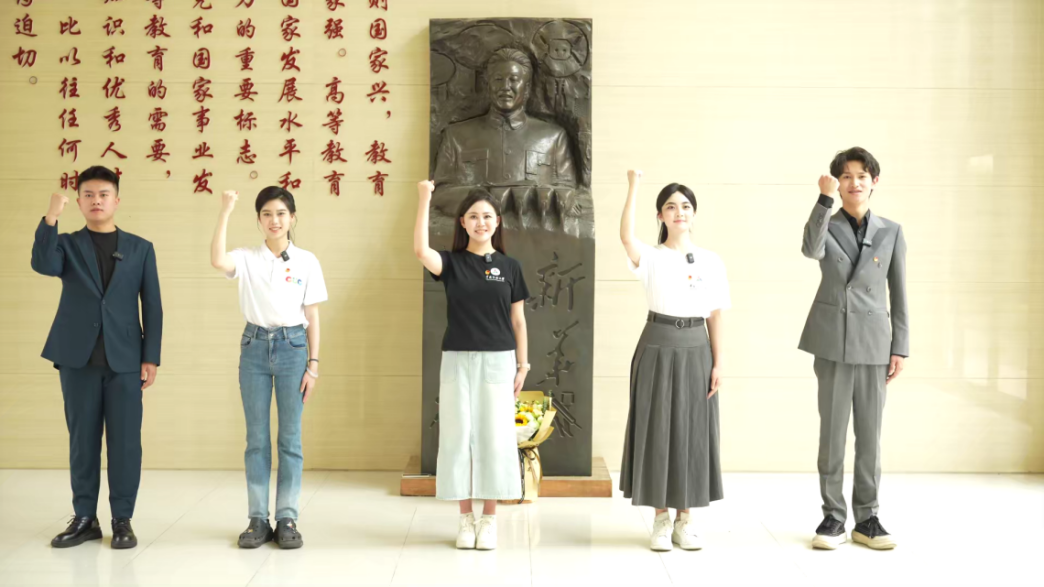 团队成员向齐越雕像献花并进行汇报朗诵,播音主持艺术学院的同学以饱满的状态发出了“请党放心、强国有我”时代强音