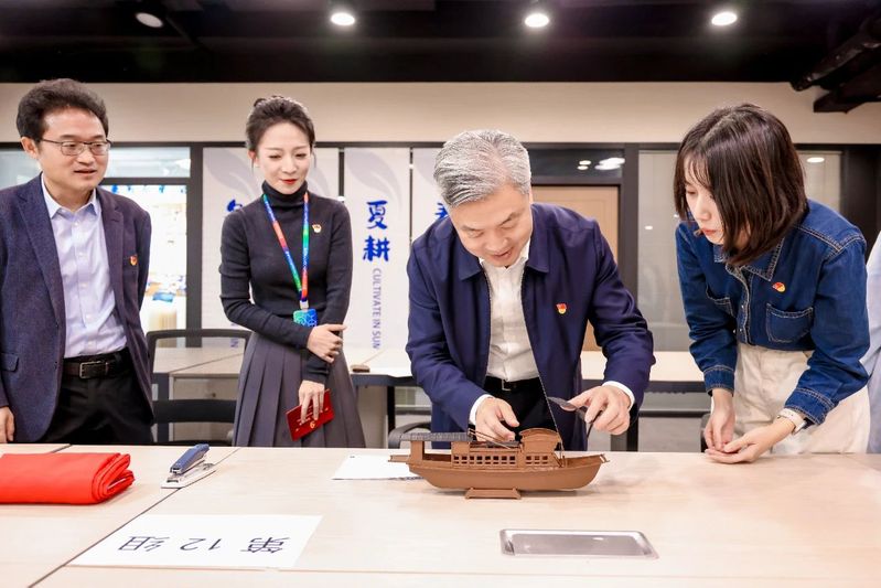 活动中,廖祥忠与同学们一起,体验榫卯、造纸、雕版、卷轴、拓印、剪纸等非遗手工制作技艺,沉浸式感受其中独特的艺术魅力与丰富的历史文化底蕴。