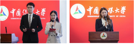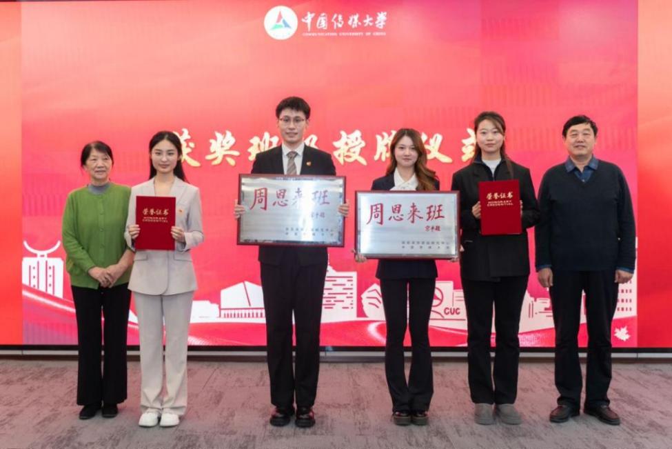张彩欣宣读授予2023级国际新闻学硕士班、2023级国际传播白杨班第二十届“周恩来班”称号的表彰决定。廖心文、李清平为获奖班级授铭牌和证书。