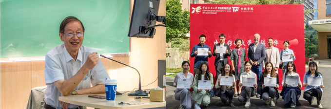 外交部翻译室前主任、前瑞典大使走进课堂(左)法国24小时新闻台新闻实训工作坊(右)