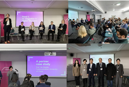 会议期间,我校代表团与其他高校一起访问了英国FutureLearn在线教育平台,并参加由FutureLearn主办的中英数字化高等教育对话。刘守训副校长受邀以《迎接AI挑战,重构传媒教育体系》为题,向会议嘉宾介绍了学校面向人工智能在学科专业、课程体系、实践、教学模式、教学评价等方面采取的全方位改革。本科生院副院长贺小飞分享了学校推进数字教育资源全球共享的整体思路以及与FutureLearn平台合作过程中的实践经验及思考。