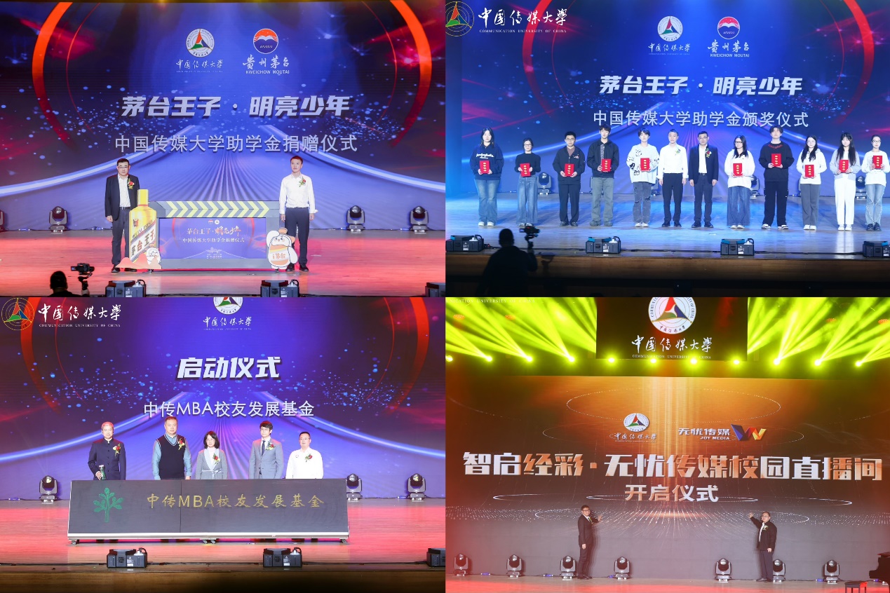 在典礼上,经管学院还举行了学院首个社会单位赞助奖学金“茅台王子·明亮少年助学金”启动仪式,由贵州茅台酱香酒营销有限公司北京省区经理詹健辉与王栋晗院长开启,并为获得此项助学金的班支基层、公益志愿、朋辈服务、五育发展、自强利他五个赛道的十位学生代表颁奖。郑苏晖书记与校友代表姜英田、陈辉、张金芳、李宁国共同开启中传MBA校友发展基金,这一公益捐赠基金凝聚着众多校友助力学院发展的情谊。此外,无忧传媒创始人兼CEO雷彬艺与刘宏欣副书记共同见证“智启经彩·无忧传媒校园直播间”的开启,为师生提供了全新的新媒体业界实践平台。