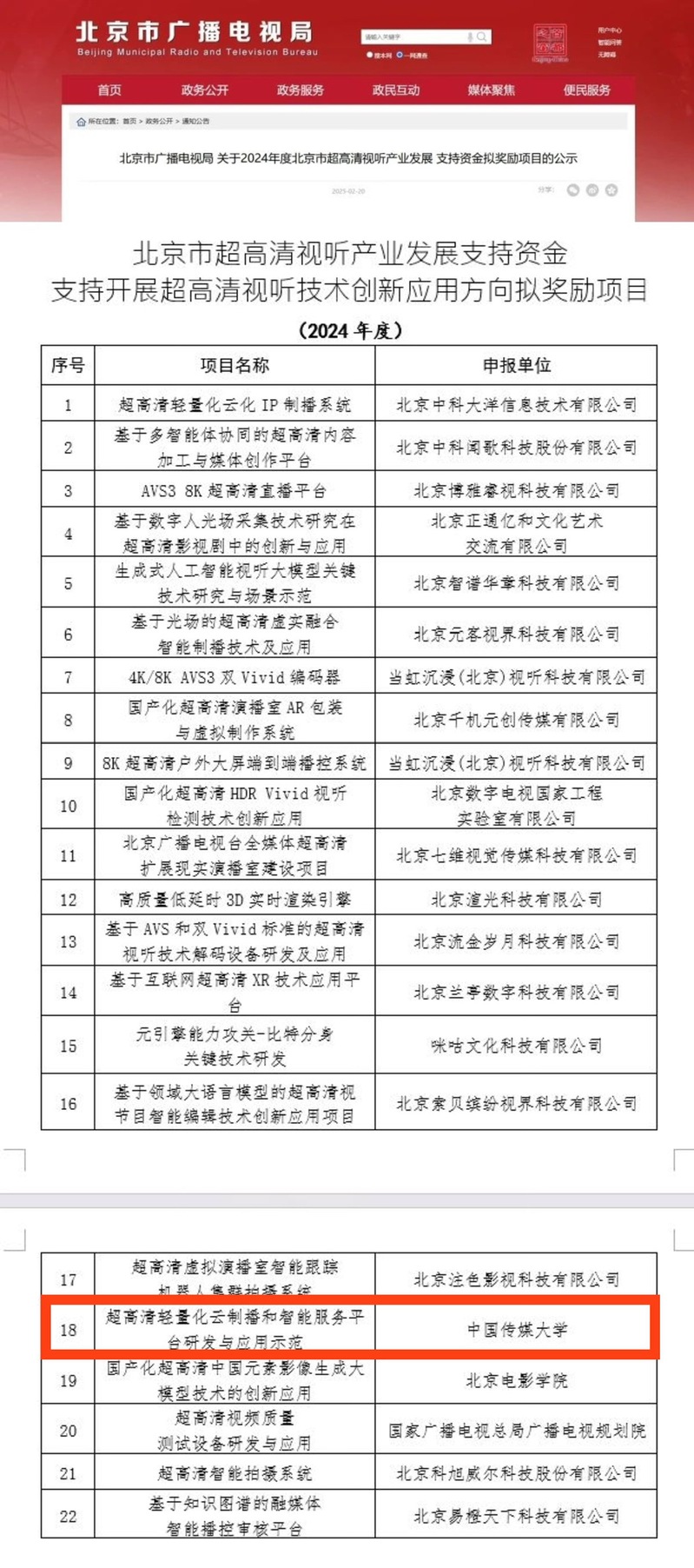 北京市超高清视听产业发展支持资金奖励项目旨在培育壮大新质生产力,全面推进北京市超高清视听全产业链优化升级,本次评选经材料初审、技术评测、现场评测、专业评测、查重比对和综合评审,最终7个方向共159个项目入选,其中超高清视听技术创新应用方向22个项目入选。