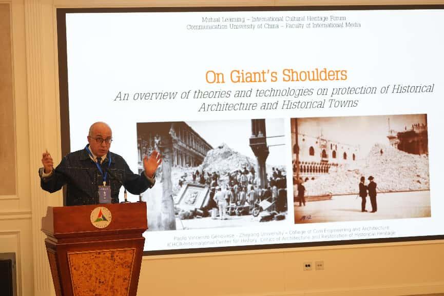 浙江大学土木工程与建筑学院特聘教授及博士生导师、国际历史建筑评论与历史遗产修复中心主任保罗·文森佐·杰诺维塞(Paolo Vincenzo Genovese)的讲座题目是《站在巨人的肩膀上——历史建筑和历史城市保护的理论与技术》,他提出了“无墙博物馆”理念,强调数字技术应突破物理边界,记录遗产的“活的灵魂”。他以威尼斯古城与中国苗寨修复实践为例,说明数字技术需平衡“真实性”与“现代性”之间的关系,既保护遗产,也传递“遗产随生活生长”的理念。