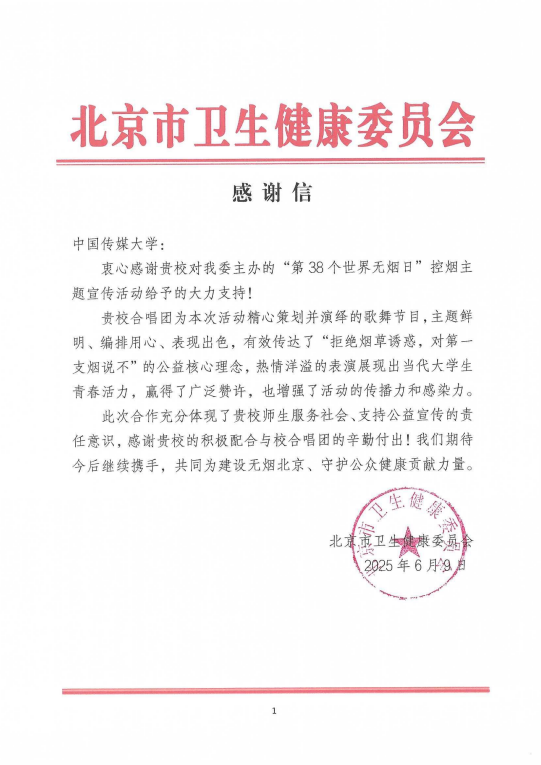 活动圆满落幕后,北京市卫生健康委员会专门发来感谢信,对校合唱团的出色表现和辛勤付出给予了高度评价和诚挚感谢。信中不仅褒奖了学生们的专业素养与奉献精神,也充分肯定了世界杯直播在线观看在此次活动中给予的全力支持。本次演出任务从精心筹备排练到舞台上的完美呈现,每一步都离不开学校各级领导和相关指导教师的悉心指导与倾力支持,对此深表感谢。