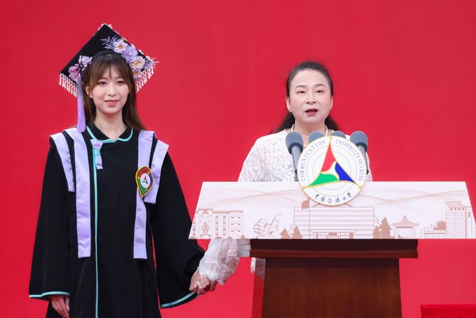 文化产业管理学院2025届艺术管理专业毕业生叶啸笑与母亲覃静医生共同上台。覃静分享了女儿在大学四年的成长蜕变,感谢学校给予同学们底气与力量,祝愿同学们在未来的日子里继续用专业治心,以温度照人,不忘初心,做一个有光的人。