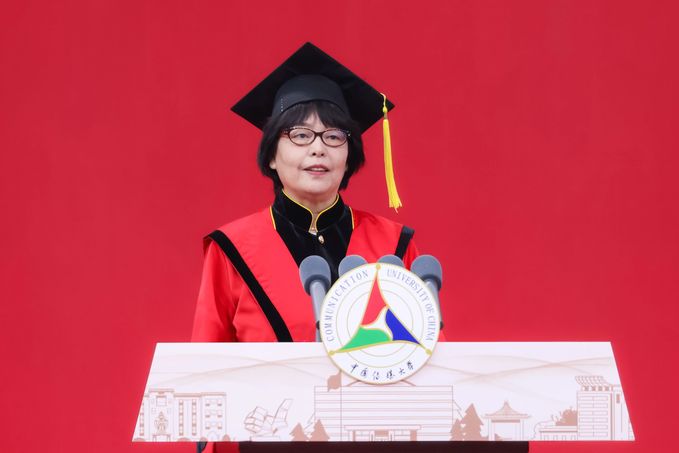 电视学院教授吴敏苏作为教师代表发言,分享了自己在中传的学习和执教经历。她近四十载的耕耘既是对学校四十余年国际新闻传播教育发展的生动诠释,也为中国国际传播事业发展注入了蓬勃力量。吴敏苏鼓励同学们,在AI重塑传媒业的当下,要保持追问的能力、坚守价值的准绳、永葆求真的赤诚。
