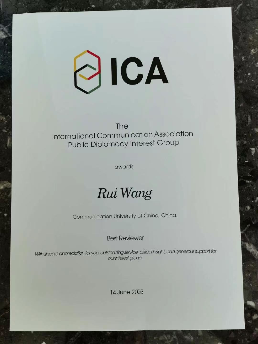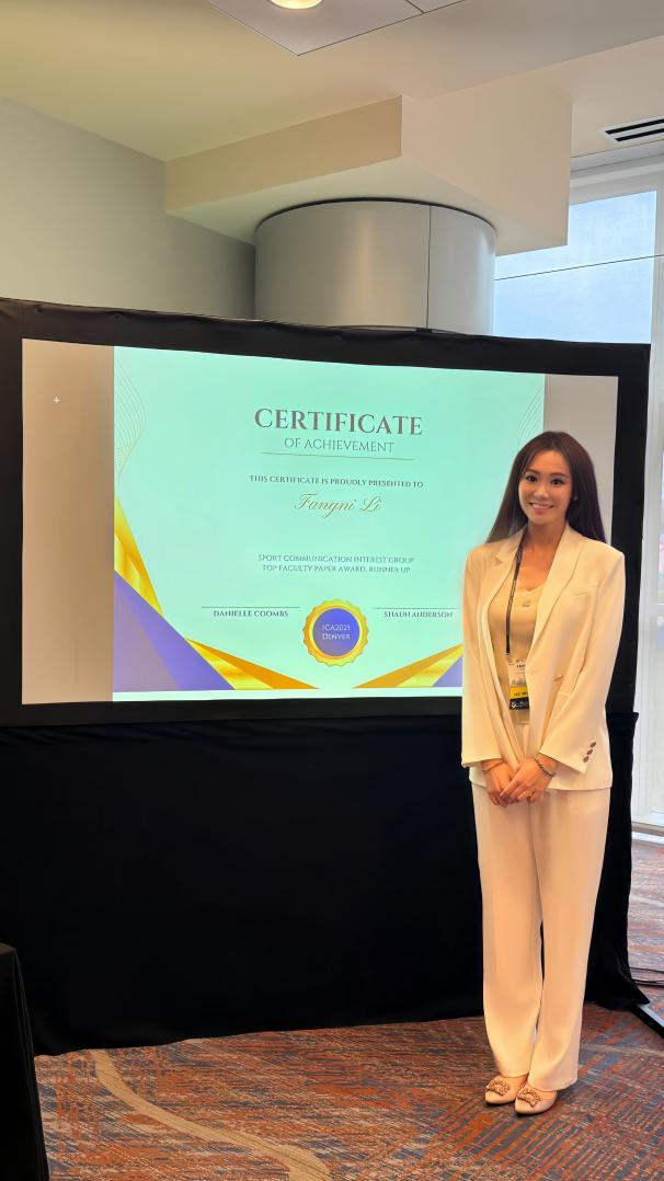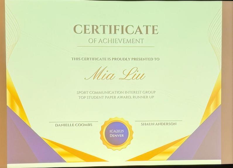 新闻学院2024级传播学(计算传播学)专业学生刘婷独立撰写论文“Research on Fandom Behavior in Sports from the Perspective of Symbolic Convergence Theory-A Case Study of Table Tennis Player Wang Chuqin’s Fans”(符号聚合理论视角下的体育饭圈化群体研究——以乒乓球运动员王楚钦粉丝为例)荣获ICA体育传播学分会最佳学生论文奖。