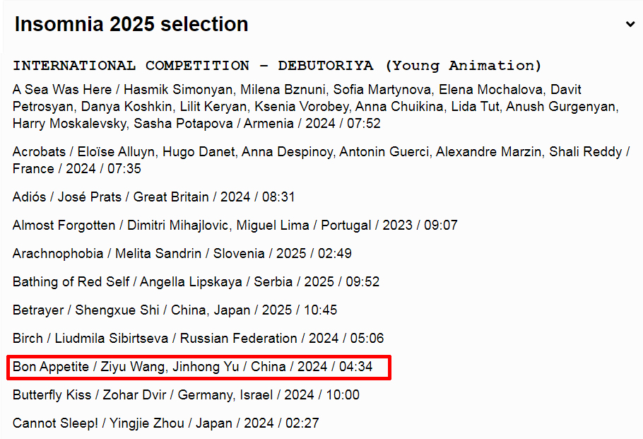 (通讯员 张若琦)近日,2025俄罗斯失眠国际动画电影节(Insomnia International Animation Film Festival)官方网站公布入围名单,我校动画与数字艺术学院2021级动画专业学生王子瑜、余金泓的作品《我要开动啦》(Bon Appetite)榜上有名,入围国际青年动画竞赛单元。