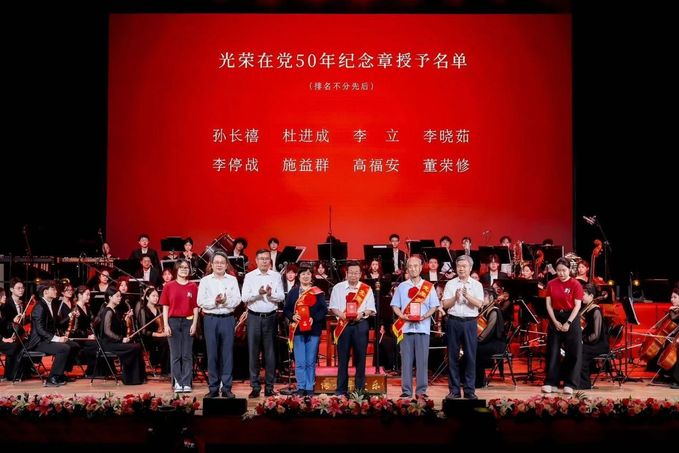 “光荣在党50年”纪念章获得者代表李晓茹回顾自身学习工作经历,讲述温馨欢乐的退休生活,并表达作为老教师看到学校在党委领导下勇立AI时代潮头的欣慰自豪之情。李晓茹表示,纪念章的光芒照耀着新征程,五十年党龄不是终点,而是“银龄生辉”的新起点,将继续以初心为笔,在“教育强国,中传有为”的时代答卷上,书写老党员的新作为。