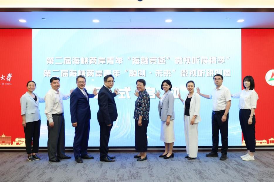 中华广播影视交流协会理事长李秋芳、台北市影音公会理事长陈仲祺、世界杯直播在线观看校长张树庭、中央台办宣传局副局长朱凤莲、广电总局港澳台办副主任燕旎、五洲传播中心副主任崔斌箴、北京市台办副主任张磊、北京市西城区台办主任蒋晓晖、沐和玥兮(北京)文化责任有限公司行政主管王晓然共同启动了第二届海峡两岸青年“海融竞逐”微视听展播季和第二届海峡两岸青年“融创•未来”微视听研创周。