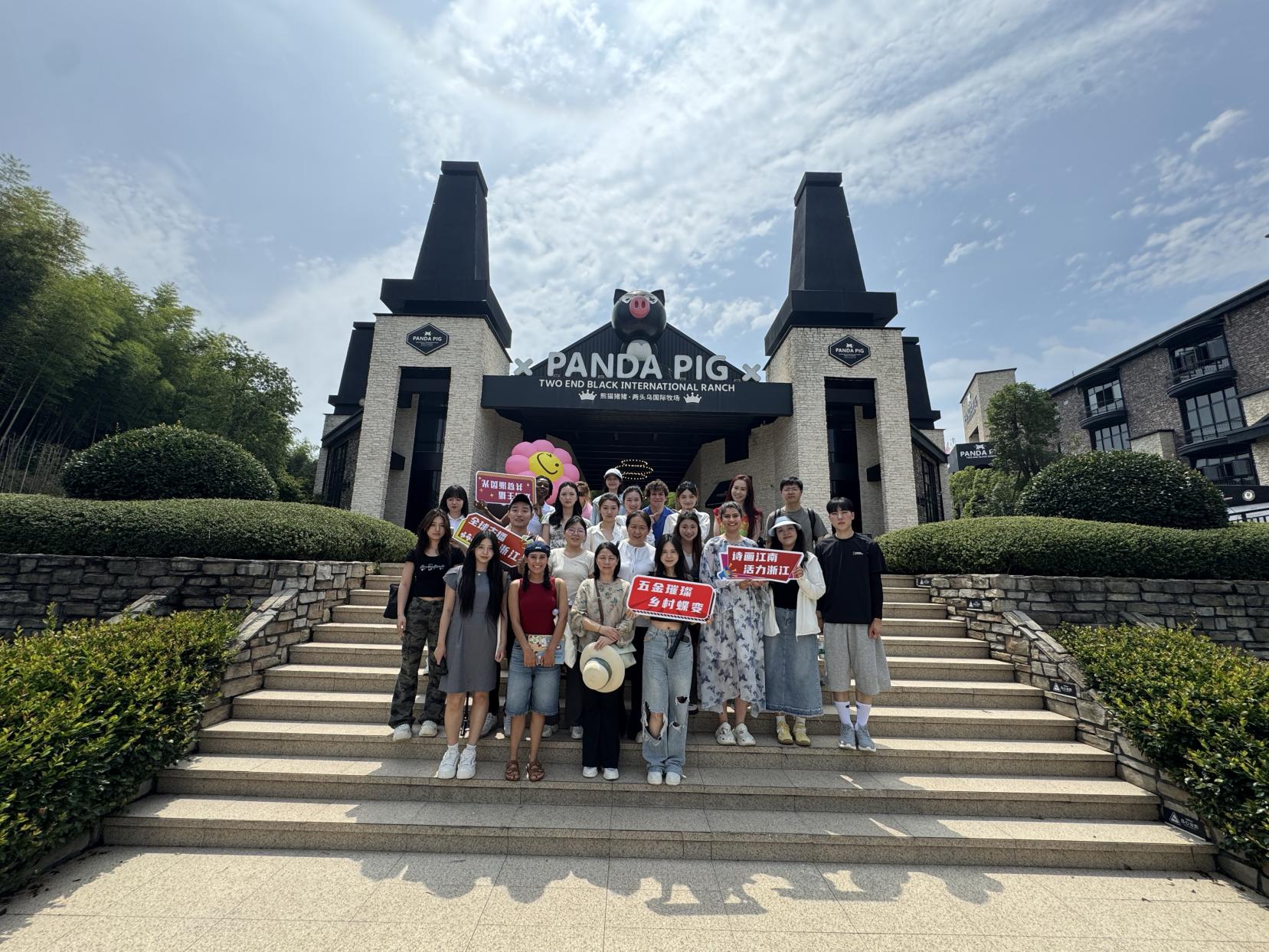全球青年双语主播在金华“熊猫猪猪”两头乌国际牧场前合影