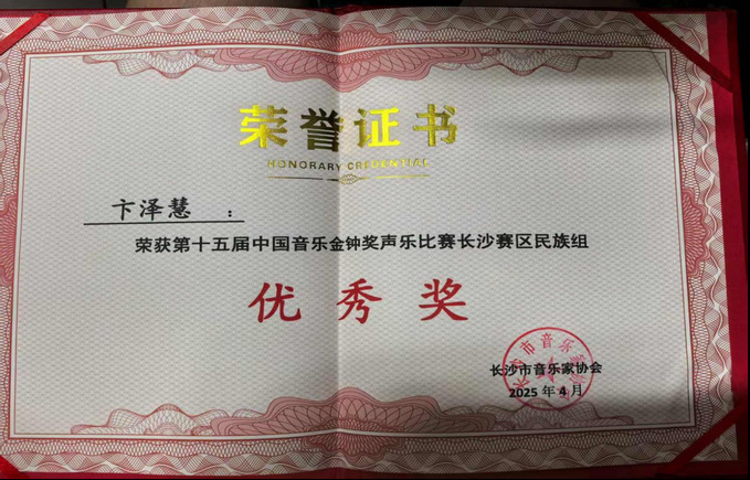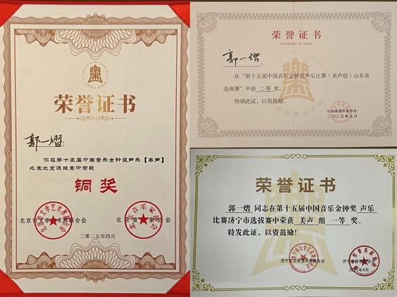 郭一熠同学先后在济宁赛区选拔赛中,以9.957分的成绩荣获美声组一等奖;在北京赛区选拔赛(声乐比赛)中,以94.474分的成绩位列第十,斩获铜奖;在山东赛区总决赛中,面对全省近50名专业选手的激烈竞争,以9.89分并列第五,荣获二等奖。卞泽慧同学在长沙赛区民族声乐组中,从300余名参赛者中脱颖而出,成功入围20强决赛,作为决赛中年龄最小的选手,荣获优秀奖。