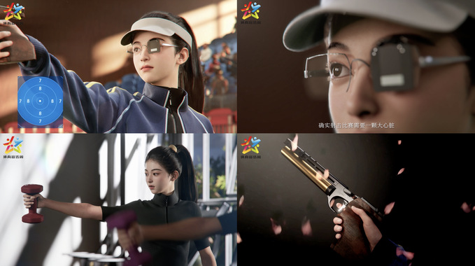 创作过程中,国家体育总局射击中心指导专家及专业运动员全程参与动作指导和数据采集,使数字人每个动作都精确到位。镜头里,扎着高马尾的少女“凌翎”屏息凝神,枪口在0.1毫米的震颤中归于静止。这位梦想身披国家队战袍的十米气手枪运动员,用百万次重复训练雕琢肌肉记忆。当短片的聚光灯聚焦赛事决胜时刻,她凝神屏息扣动扳机,弹道轨迹在空气中凝结的刹那,中国射击运动“百炼成钢”的精神图腾跃然展现。