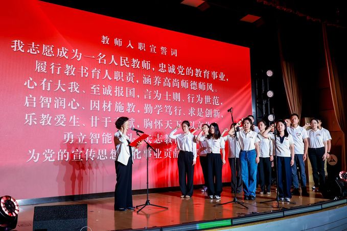 新入职教职工在退休教授高慧燃的带领下庄严宣誓,承诺接续奋斗、不负使命,体现了中传教师精神在新时代的薪火相传。