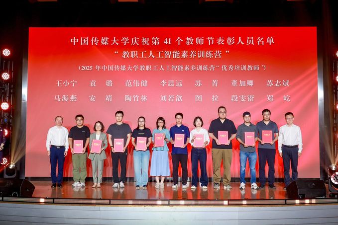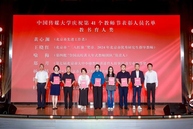 大会表彰了2024-2025年度在党建引领、教书育人、服务创新等领域涌现出的先进集体和个人。播音主持艺术学院党委、媒体融合与传播国家重点实验室党委、外国语言文化学院欧洲语系教工党支部、电视学院广播电视学系教工党支部、信息与通信工程学院数字媒体技术系教工党支部、经济与管理学院传媒经济系教工党支部等基层党组织,黄心渊、王晓红、郑月、喻梅等教书育人先进个人,以及在乡村振兴、信息报送、学生工作、后勤保障、人工智能素养培训等工作中表现突出的单位和教师依次上台接受荣誉。