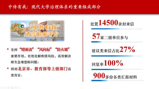 宋洋在本次大会上对“中传有我”建言献策平台的使用、意见收集及反馈等情况作了全面介绍。他回顾了平台自使用以来在完善校园设施、保障师生生活等方面所做出的贡献。宋洋指出,“中传有我”建言献策平台高效解决师生急难愁盼问题,得到了上级部门的高度肯定,体现了学校各级领导对学生建议的重视,充分表达了利用平台建设提升校园管理的决心。