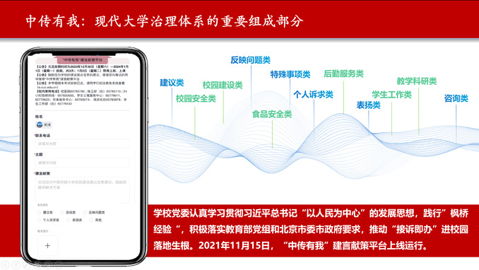今年,“中传有我”建言献策平台开通了微信公众号,建言献策平台的使用将学代会的提案收集环节融入到学生生活的日常点滴中,打通了便捷高效的意见收集新渠道,让全校更多同学参与到学代会的议程中,以点滴建议摹画更优质的团学组织建设,构筑更温馨的校园生活。