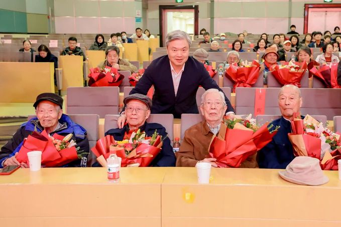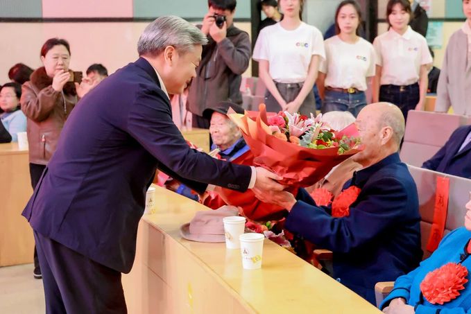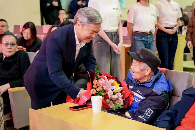 廖祥忠为90岁及以上的寿星代表献花,并致以问候。学校领导班子成员、党委常委、校务委员会主任为年满80岁、70岁寿星代表送上鲜花,表达祝福。
