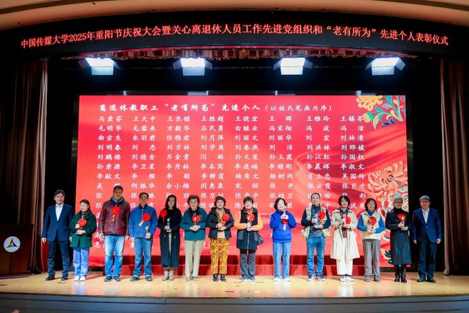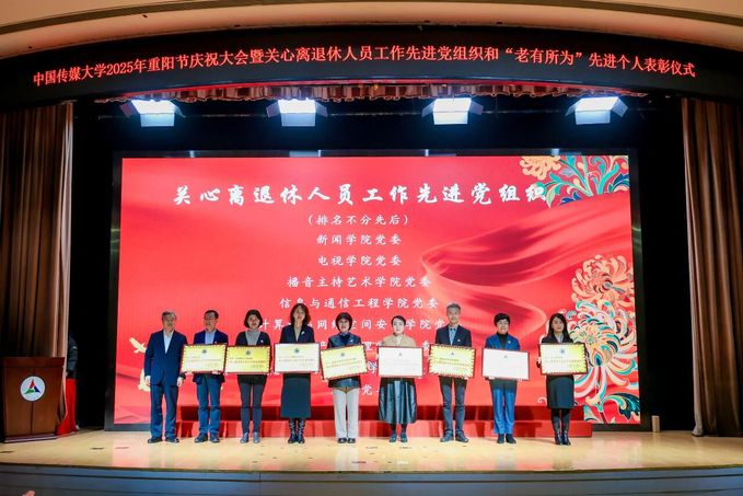 新闻学院党委、电视学院党委、播音主持艺术学院党委、信息与通信工程学院党委、计算机与网络空间安全学院党委、文化产业管理学院党委、马克思主义学院党委、后勤党委共8个基层党组织,以及在服务学校基层党建、管理服务、教学科研等领域践行“老有所为”先进个人依次上台接受荣誉。