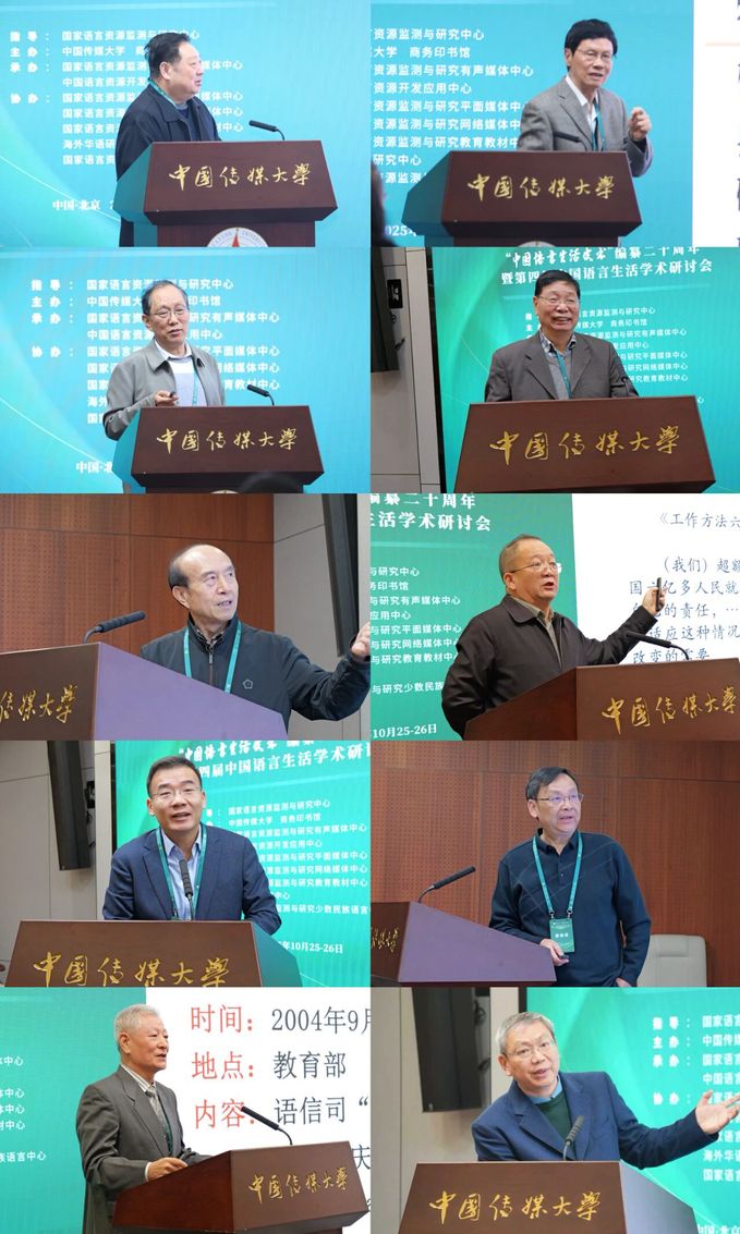 北京语言大学教授李宇明,江苏师范大学特聘教授、中国社会科学院研究员周庆生,暨南大学教授、海外华语研究中心创始主任郭熙,厦门大学教授、国家语言资源监测与研究教育教材中心主任苏新春,武汉大学教授、中国语情与社会发展研究中心创始主任赵世举,广州大学教授、国家语言服务与粤港澳大湾区语言研究中心主任屈哨兵,北京大学教授、北京大学中国语言学研究中心副主任詹卫东,云南师范大学教授、《语言战略研究》副主编罗骥,广东外语外贸大学教授、《中国语言生活状况报告》副主编汪磊,南京大学教授、《中国语言生活状况报告》副主编方小兵先后作大会报告。