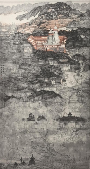 作者阐释:作品《千仞炽烽铸界碑》以“斧劈皴”技法描绘山骨的刚硬,以“泼墨法”渲染山涧的混沌,意在呈现自然环境的严酷冷峻,表达对坚守边关将士的无上礼赞以及对家国意志如山不可移的讴歌。