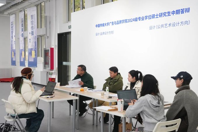 展览期间,广告与品牌学院设计专业硕士研究生中期答辩在展厅举行,旨在推动学术氛围与专业气息深度交融,既充分彰显专业硕士培养的实践导向,也正式开启“以展促评”的教学改革探索之路。