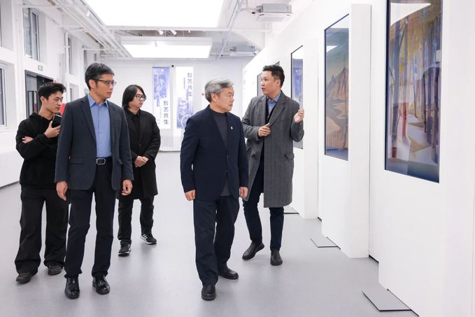 展览现场,校领导驻足各展区,认真聆听作品的创作背景、技术应用情况及实践意义。策展人武定宇详细介绍了学院在 “人工智能赋能传播设计” 方向的课程建设与人才培养模式,学院正积极推动从 “设计的传播” 向 “传播的设计” 转型,全力构建具有中传特色的交叉学科体系。