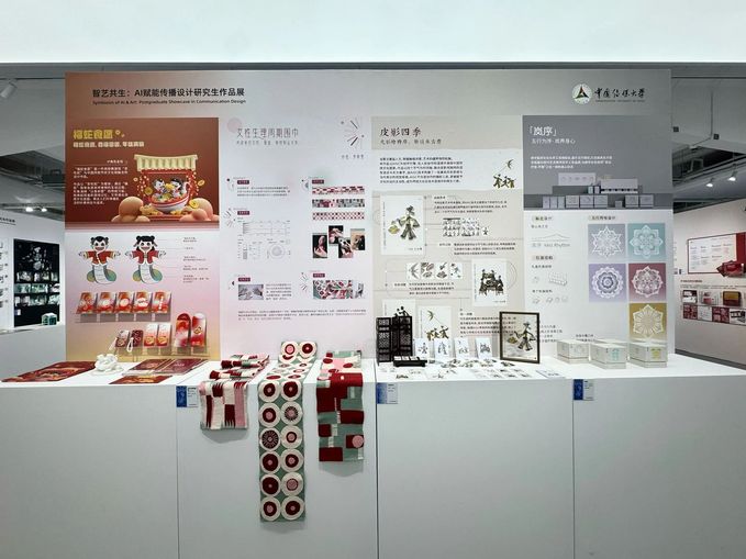 主题单元展览共设“智绘传播”“品牌声场”“以艺塑城”三大版块,系统呈现研究生在“AI赋能传播设计”领域的探索与成果。“智绘传播”聚焦智能技术、传播路径与设计实践的深度融合,展示研究生在国际传播与品牌传播方向上的创意实验,作品以生成式人工智能、多模态叙事等手段探索数智时代的传播形态与文化表达;“品牌声场”关注人工智能与品牌传播的融合创新,涵盖商业品牌重塑、文化品牌活化及数字思辨实践,展现AI在品牌构建中的创意潜能与意义生成;“以艺塑城”则聚焦空间设计与区域文化的共生关系,通过公共艺术、沉浸叙事与交互体验,探索城市、景观与文化遗产在智能语境下的再生机制。三大版块共同构成了一个兼具学术深度与时代前瞻性的设计图景,不仅直观呈现了“人机协同”的教学理念,更体现出传播设计学科服务国家战略、回应社会需求的责任担当。