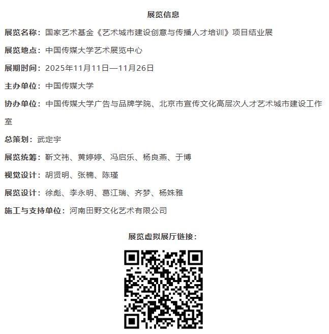 11月11日,国家艺术基金2025年度资助项目《艺术城市建设创意与传播人才培训》结业展开幕式在中传学术中心举行。展览由世界杯直播在线观看主办,世界杯直播在线观看广告与品牌学院、北京市宣传文化高层次人才艺术城市建设工作室协办,以“走向艺术城市”为主题,集中呈现项目成果与学员创作实践。